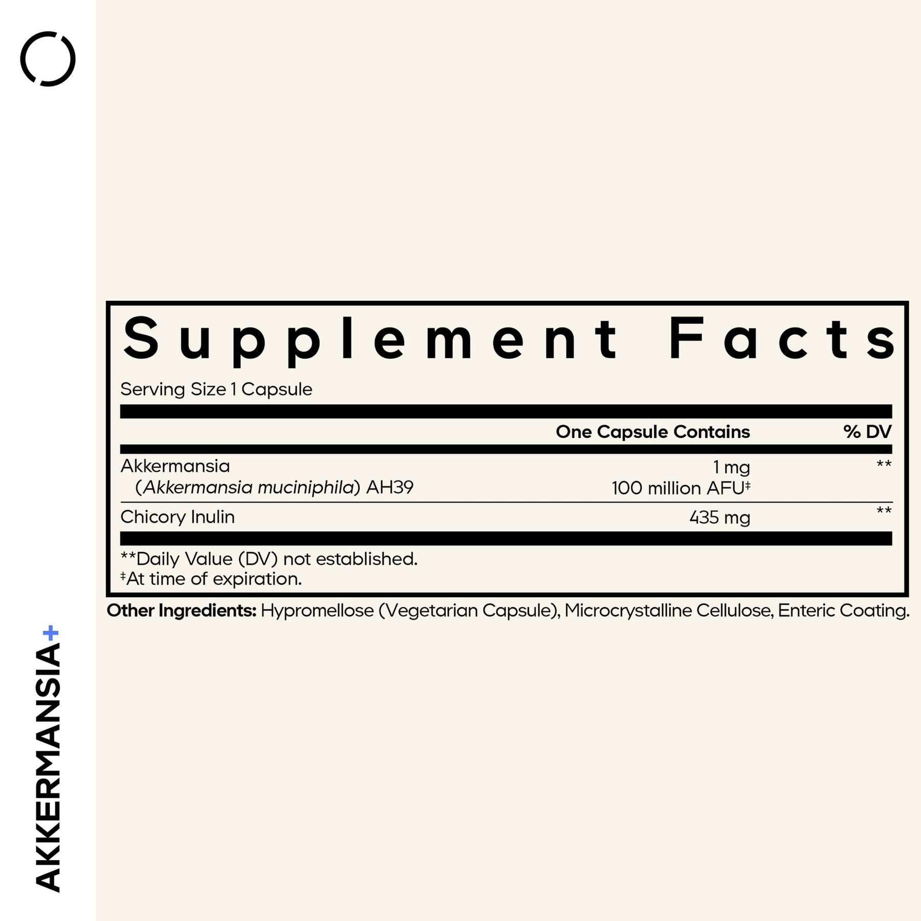 Akkermansia (Akkermansia Muciniphila) AH39, Chicory Inulin. Other Ingredients: Hypromellose (Vegetarian Capsule), Microcrystalline Cellulose, Enteric Coating.