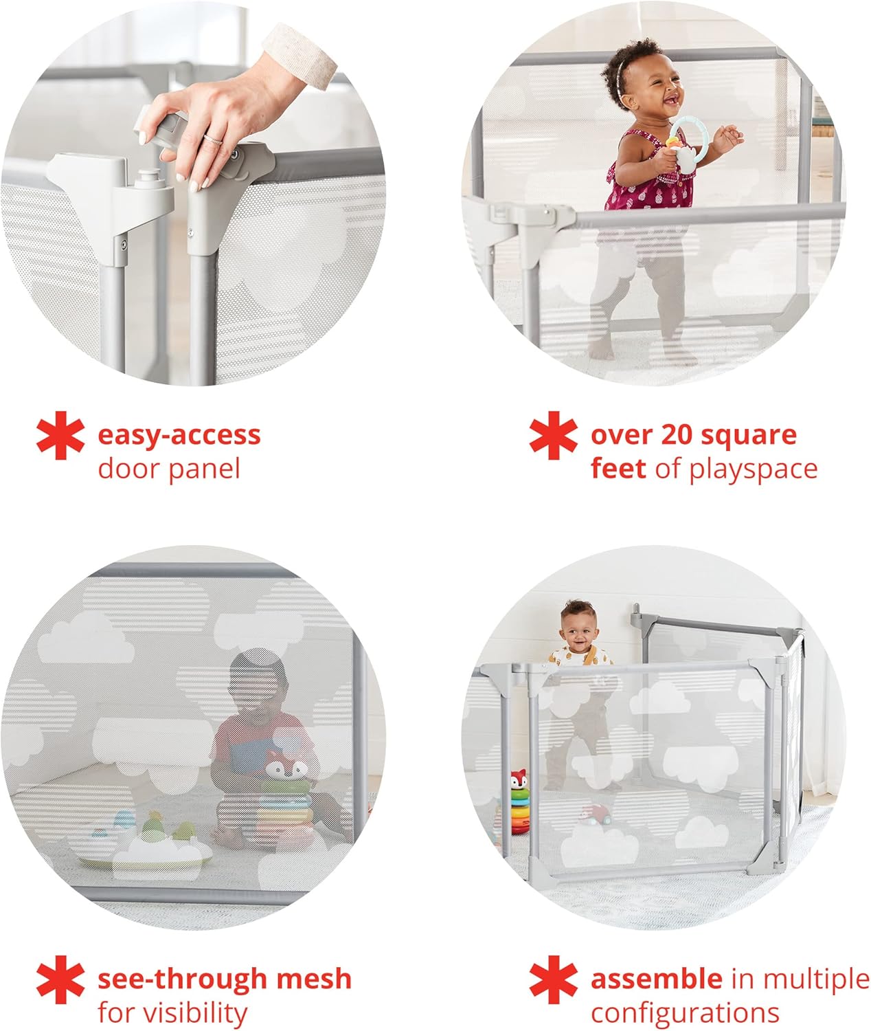 • Featuring six cloud-print mesh panels that allow visibility between parent and chid, our décor-friendly play yard & baby fence keeps baby contained and in sight