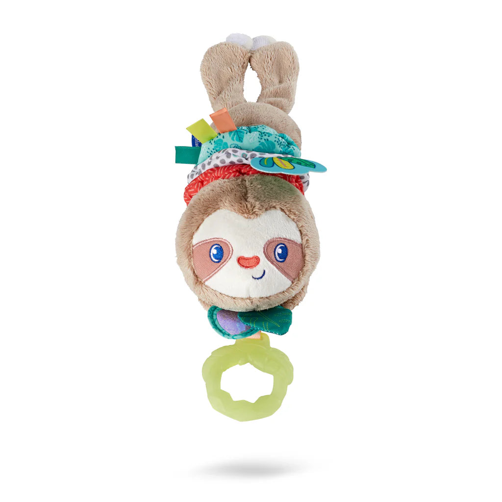 This huggable, tuggable musical sloth plays a sweet lullaby when you gently tug its arms. Perfect for entertaining little ones while out and about! Plays music for 90 seconds. Hang to encourage reaching, grabbing and cause & effect. Plush, multi-textured fabrics & ribbons support tactile exploration. Soft BPA-free multi-textured teether. Easily attaches to car seats, strollers and gyms.