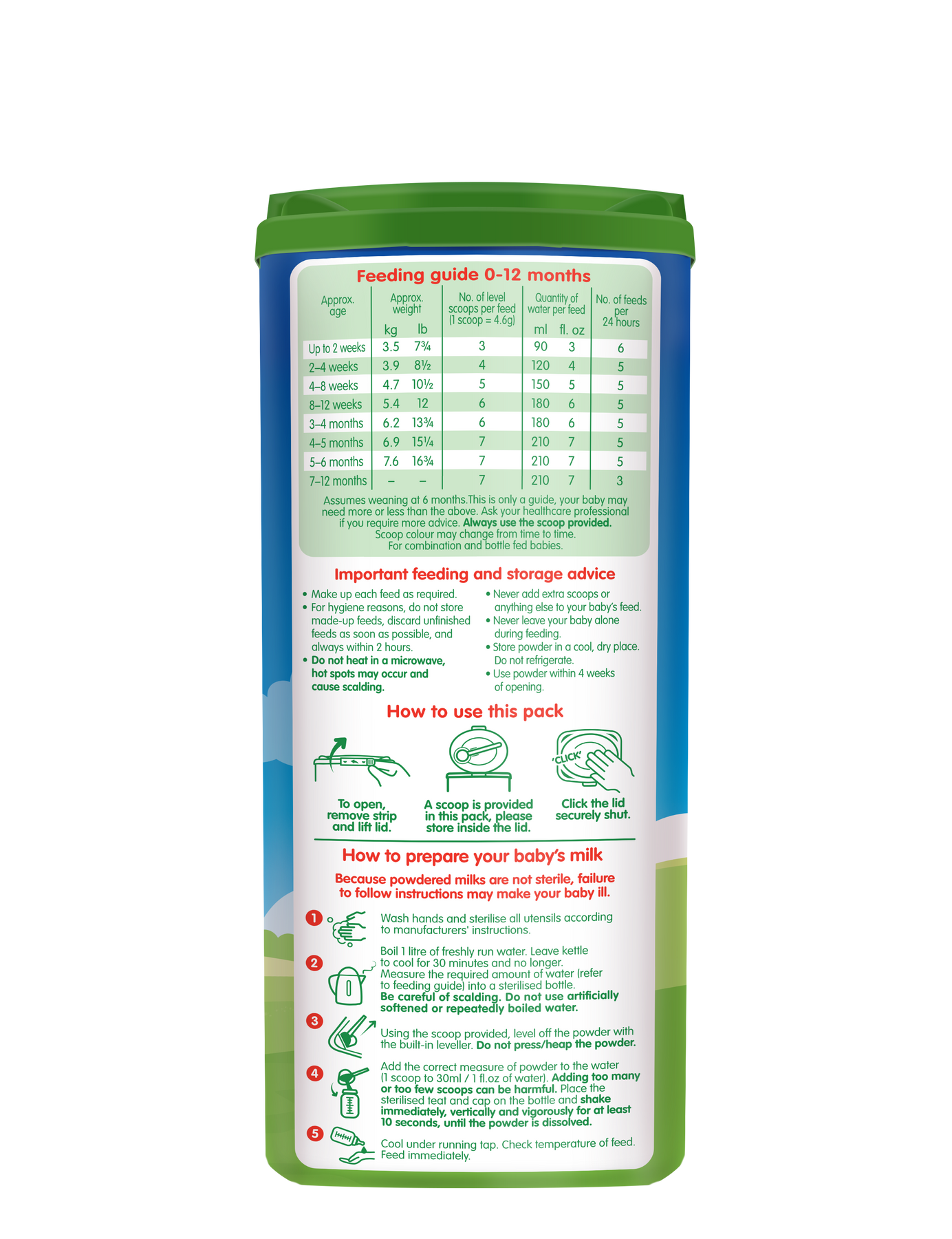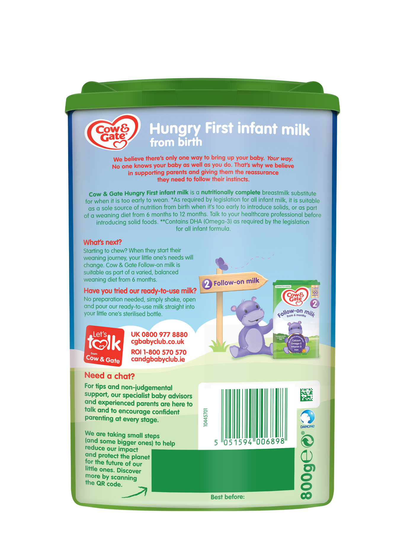 Cow & Gate Hungry First Infant Milk 800g is designed for when it is too early to wean. It is made with milk from grass-fed cows, contains no palm oil and is nutritionally complete. It can be used to substitute breastmilk as a sole source of nutrition from when your baby is born or as part of a weaning diet from 6 months.