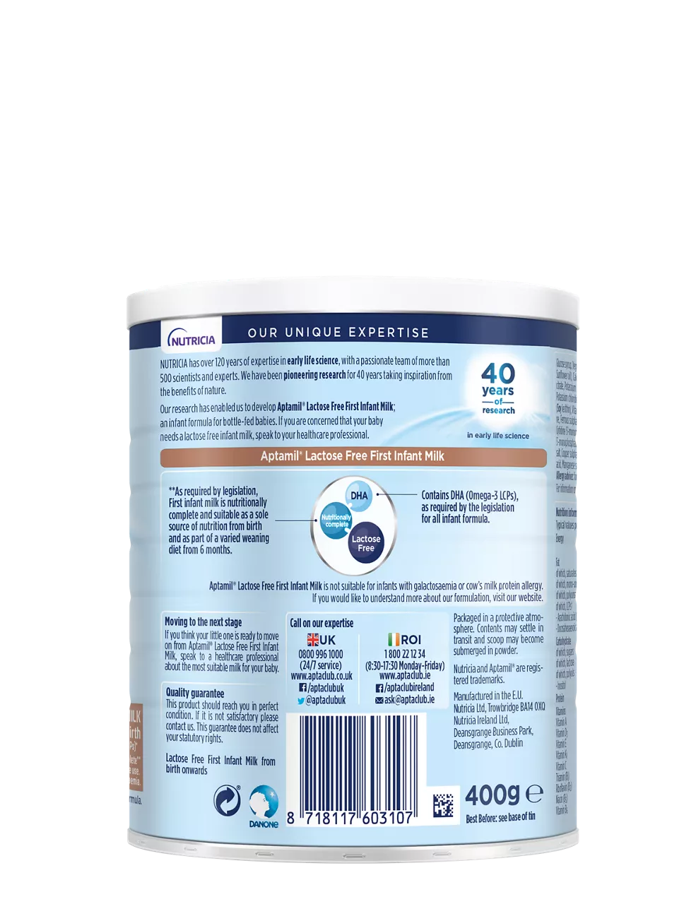 Inspired by 40 years of research in early life science, our team of Nutricia scientists has developed our latest Aptamil Lactose Free First Infant Milk powder, suitable from birth.