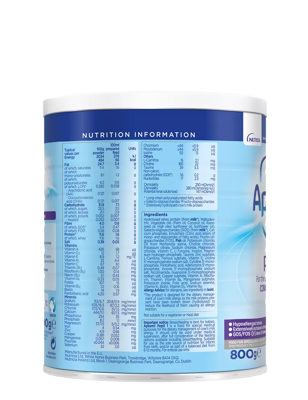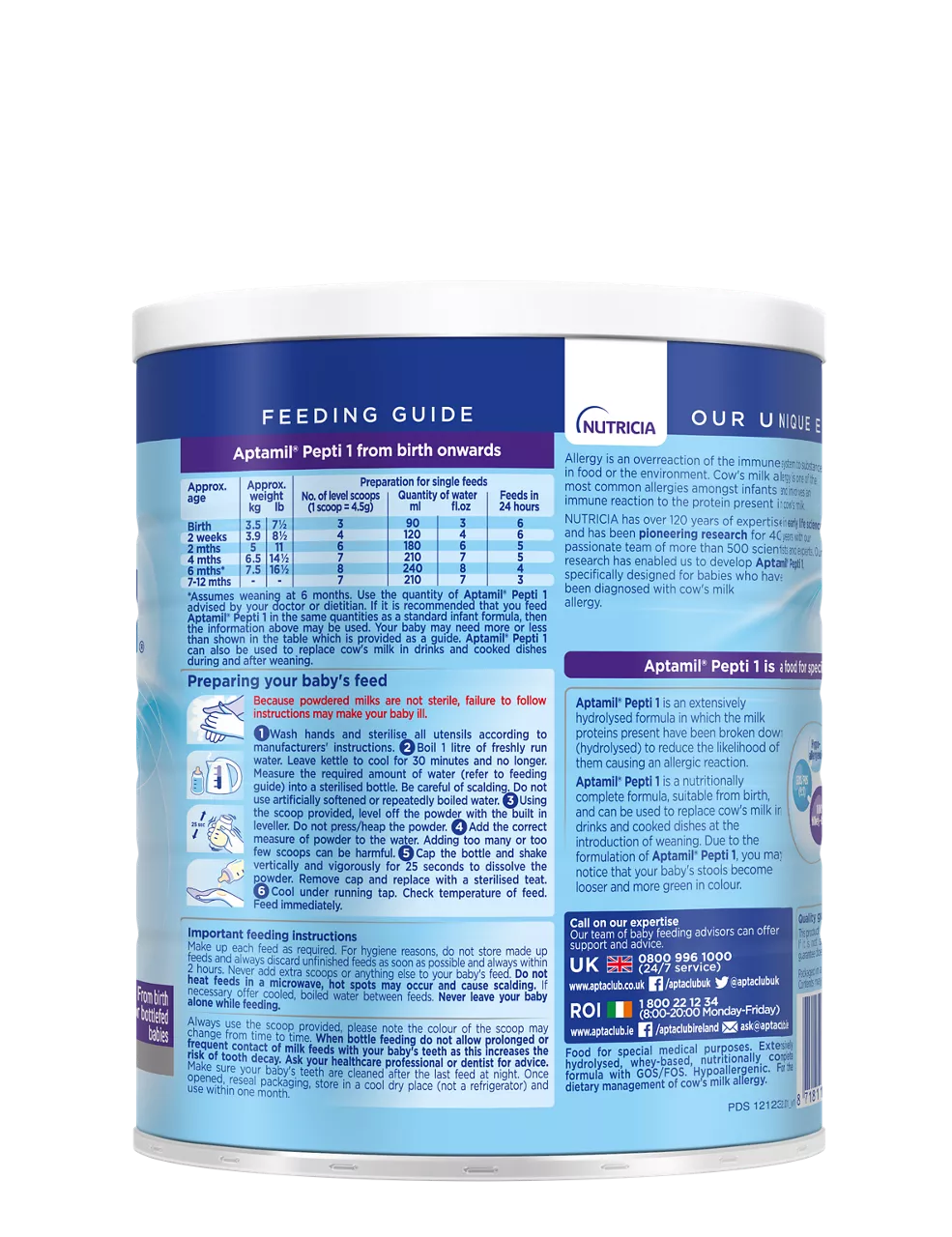 Suitable from birth, Aptamil Pepti is a nutritionally complete formulation for the dietary management of cow's milk allergy (CMA).