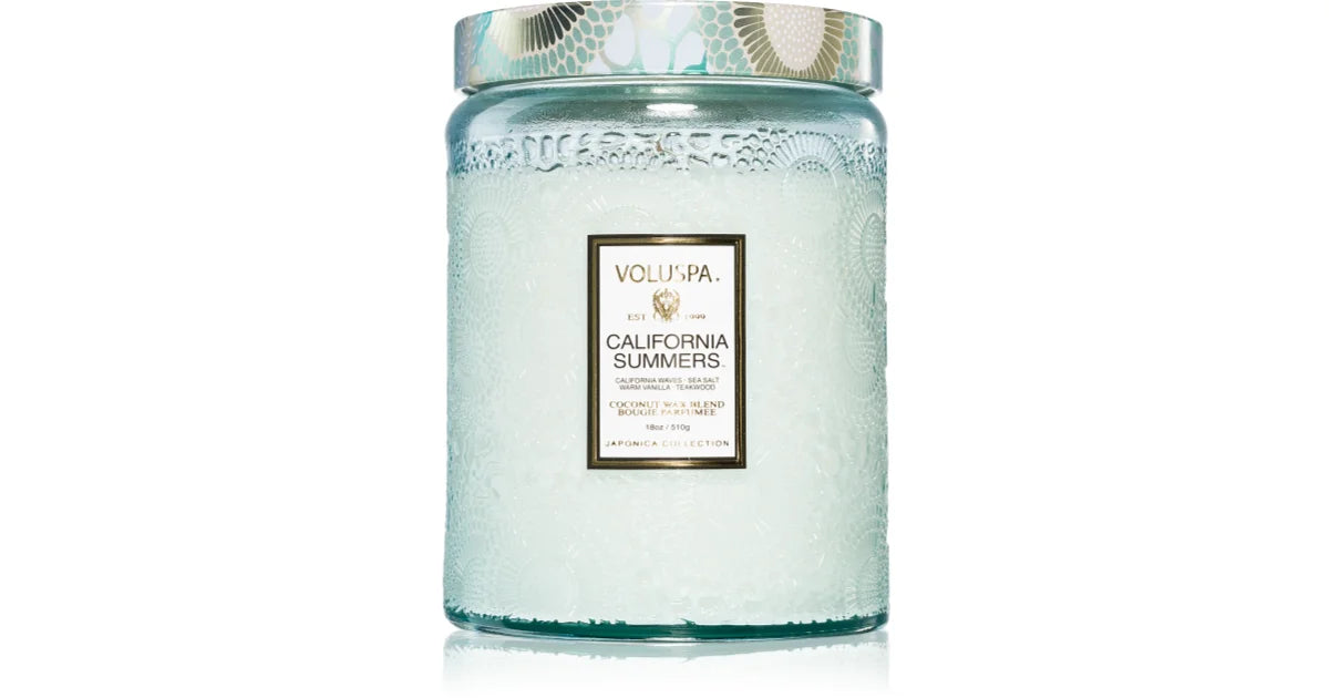 Plunge into the blue horizon and escape into another realm, where worries are reduced to coasting on hypnotic rolling waves. A salty ocean breeze tickles the skin as the sun reaches its peak height of the day, leaving you to bask in a teakwood sling chair, lathered in a tonic of warm vanilla and coconut milk. Welcome in the rising tides to wash away the cares of the day. Voluspa invites you to take the scenic route, so you may always return for California Summers.