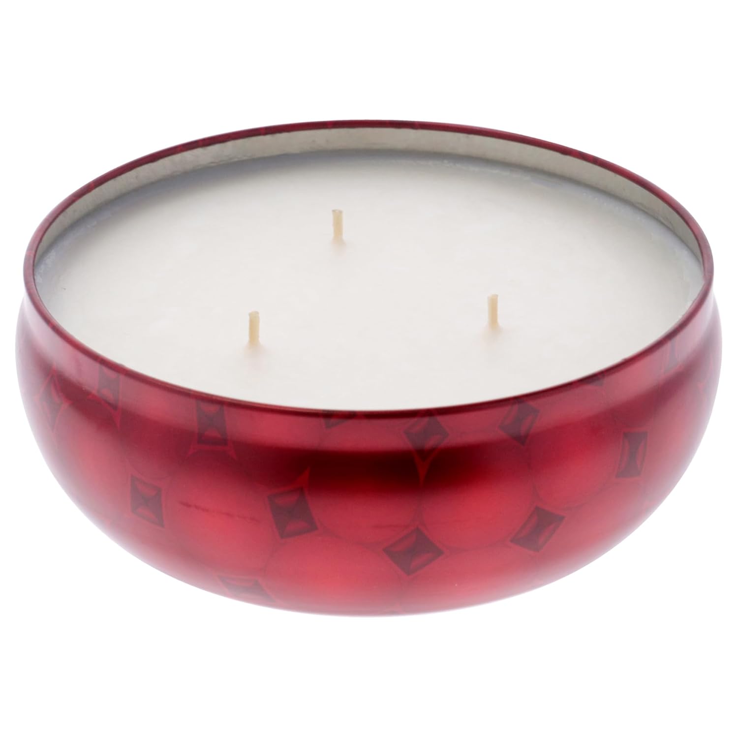 Three wicks for a generous wax pool, sculpted bold red pattern wrapped top to bottom with an embossed lid.