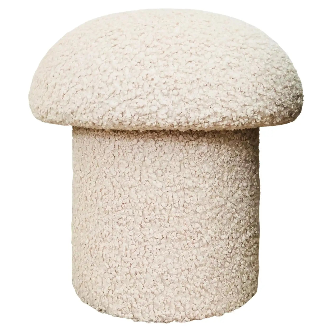 A handmade mushroom shaped stool, upholstered in a white colored curly boucle fabric. Perfect for using as a footstool or extra occasional seating. A comfortable cushioned seat and sculptural accent piece. Mushroom ottomans are made to order, customizations are not possible. PLEASE NOTE: Colors shown on screen may be a close match, but please do not rely on them to be an exact match.