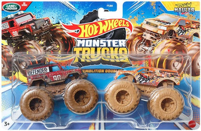 HOT WHEELS MONSTER TRUCKS 1:64 SCALE DEMOLITION DOUBLES - LAND ROVER DEFENDER VS TOWN HAULER TWIN PACK