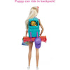 Take the camping story from day to night with a backpack that opens and closes to store hiking essentials and a colorful sleeping bag that keeps Barbie doll and puppy cozy at night
