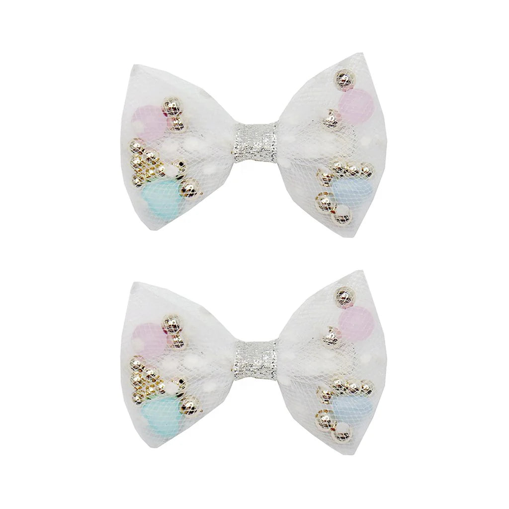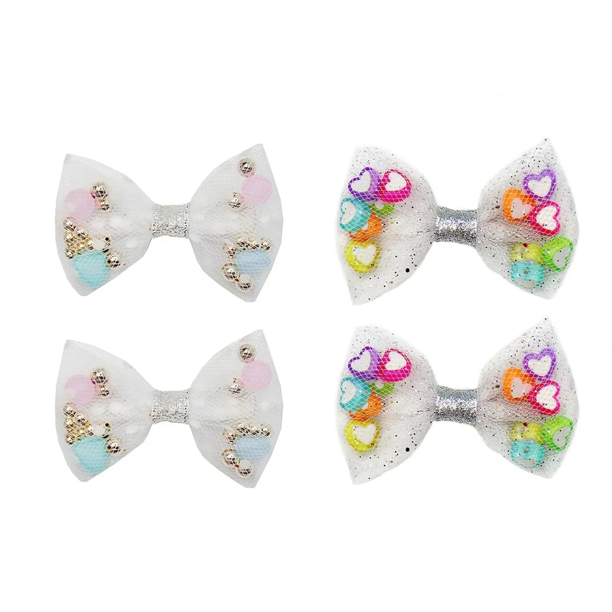 These 2 piece bow clips are the perfect accessory! Choose from the princess pinks or the rainbow brights. Each clip is made from a soft mesh tulle pocket pinched together and wrapped with glitter trim. The pockets are filled with tiny beads and hearts, perfect for a bowtastic party!