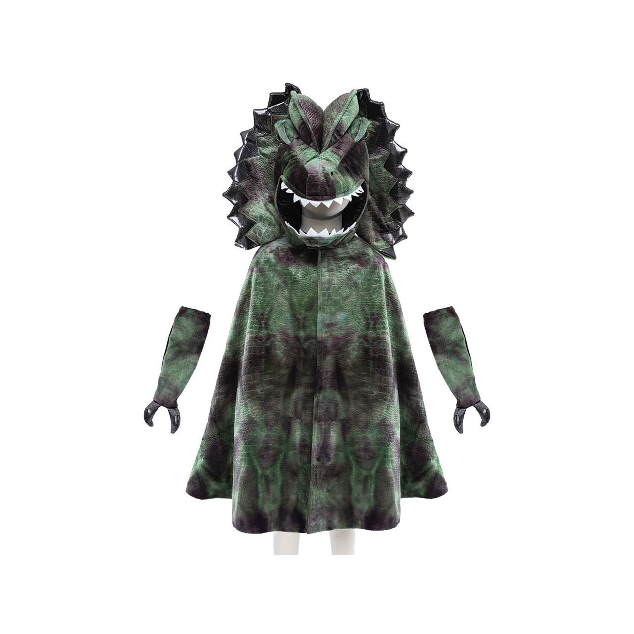 Does your Triceratops or T-Rex need a friend? Your child will love this super cute, totally monstrous dinosaur cape! This green, grey, and purple tie-dye cape is lined with black lining. Detailed with grey and purple metallic spikes down the back. The dinosaur head has a removable mouthpiece to ensure a secure fit. This is a two-piece set - cape & claws included.