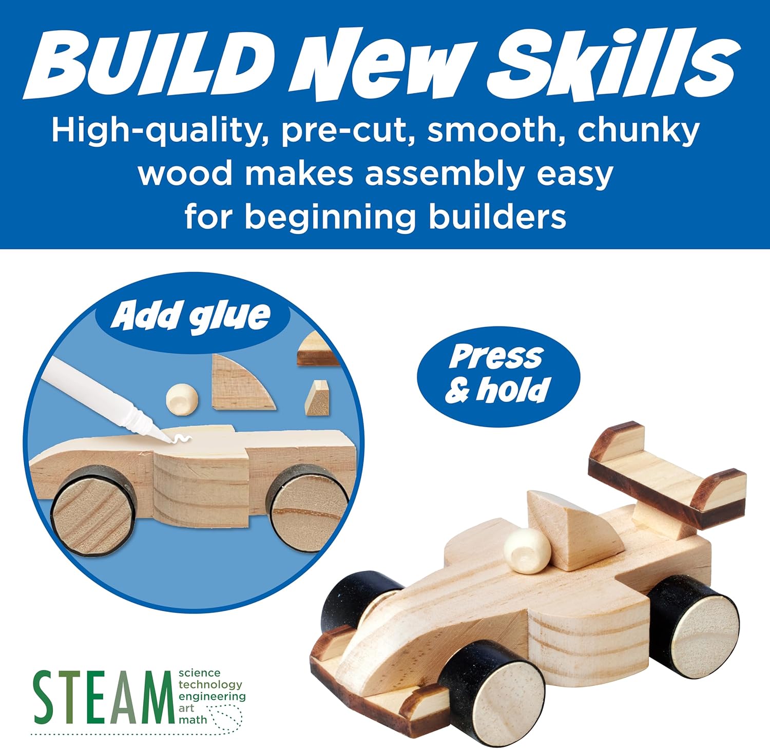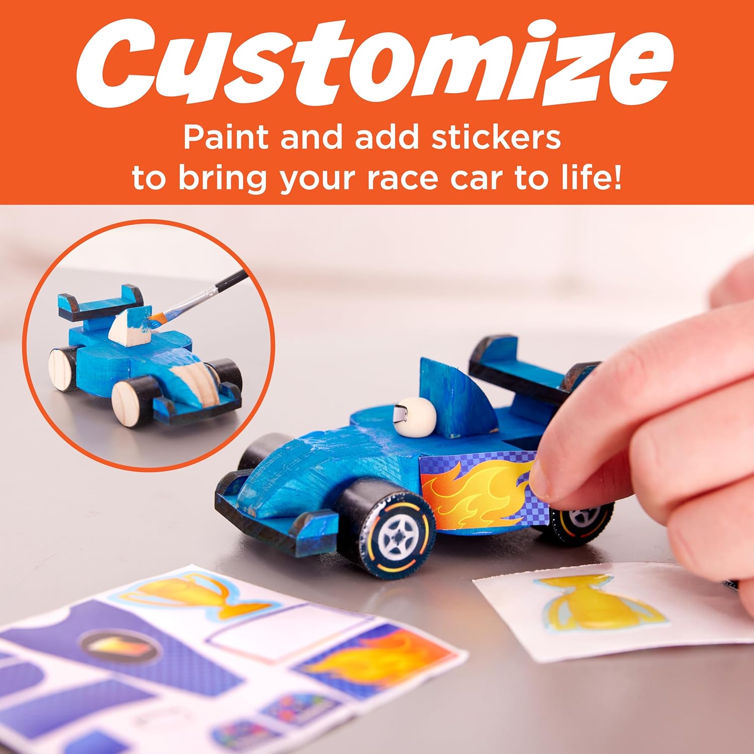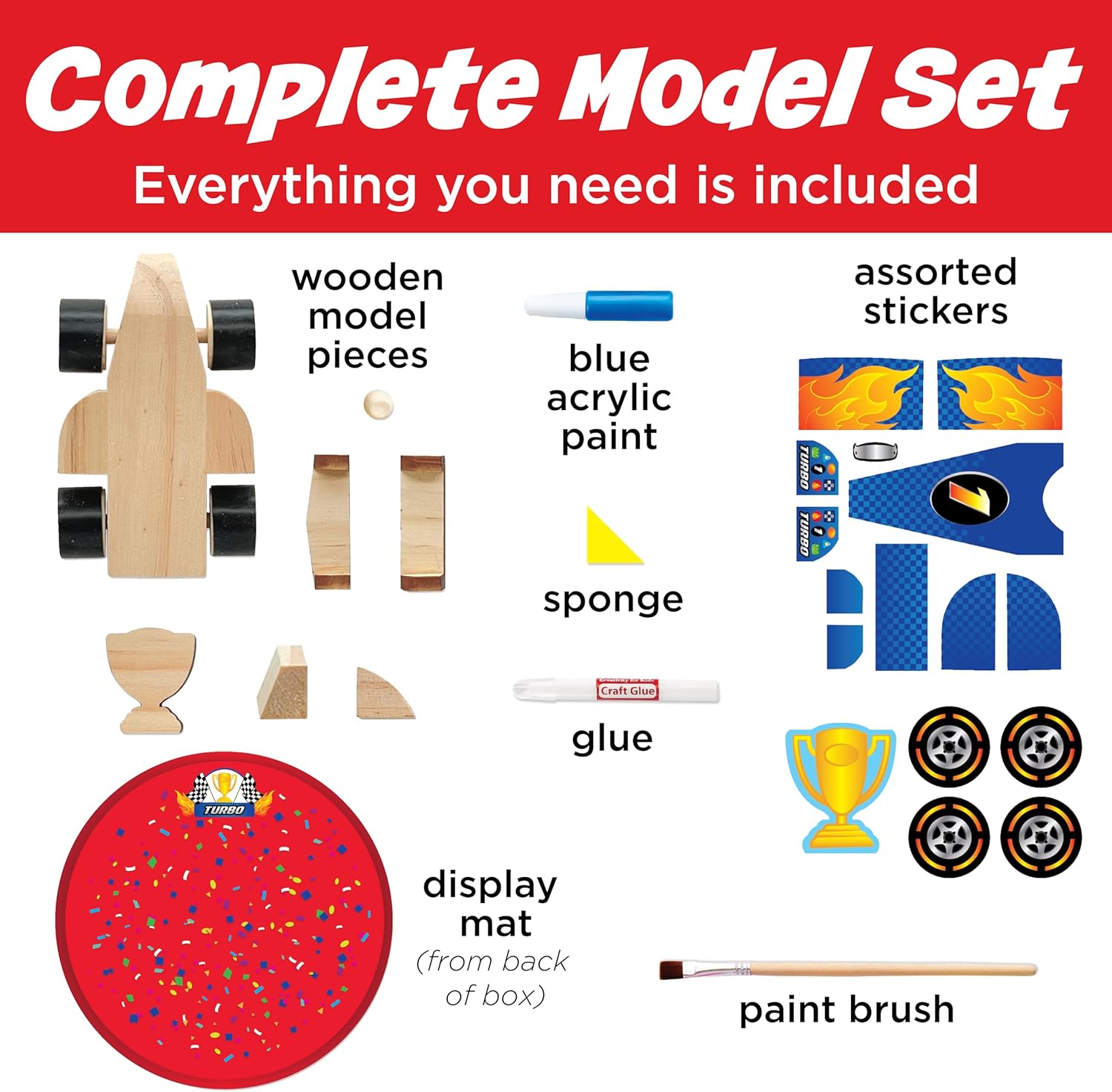 Contents Include: 6 Wooden race car model pieces, 1 Wooden winner's trophy, Assorted stickers, 1 Paintbrush, 1 Sponge, 1 Craft glue tube, 1 Acrylic paint tube Blue 0.16 fl. oz, Display mat on packaging and Instructions