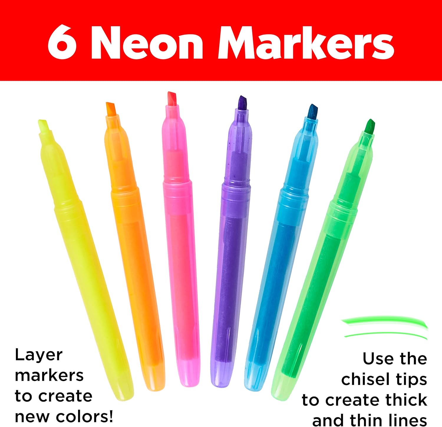 - COLORING ACTIVITY KIT - Use 6 water-based, neon markers to bring monsters, unicorns, space pets and more to life with this complete coloring art project. The coloring markers feature a chisel tip to create thick or thin lines and easily layer to create new colors