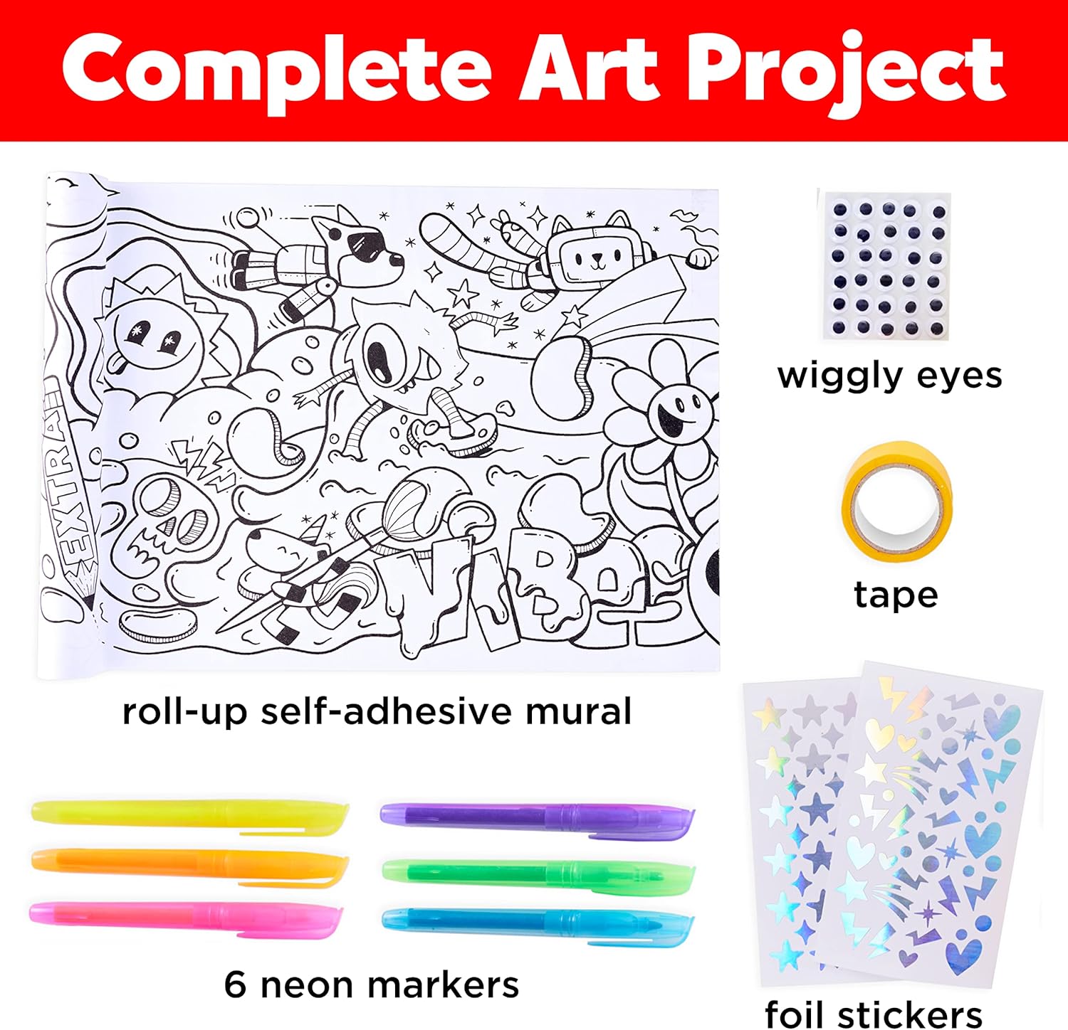 - ART PROJECT FOR KIDS - Includes everything you need to color, decorate and hang a kid-friendly coloring poster! This coloring kit for kids comes with a self-adhesive coloring roll, 6 neon markers, foil sticker sheets, wiggle eyes, painter’s tape and instructions!