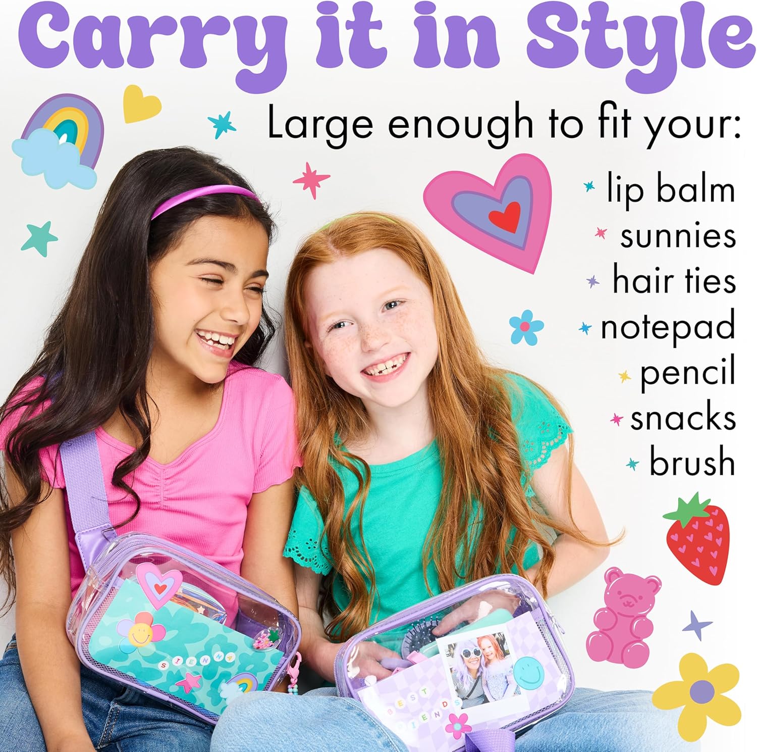 - BELT BAG CRAFT KIT: Design your very own stylish belt bag! This DIY craft kit for girls includes everything needed to create a unique, fashion-forward accessory. Customize your clear crossbody bag with plenty of cute stuff including decorative inserts, playful stickers, and photos - the perfect arts and crafts for kids ages 6-8 girls