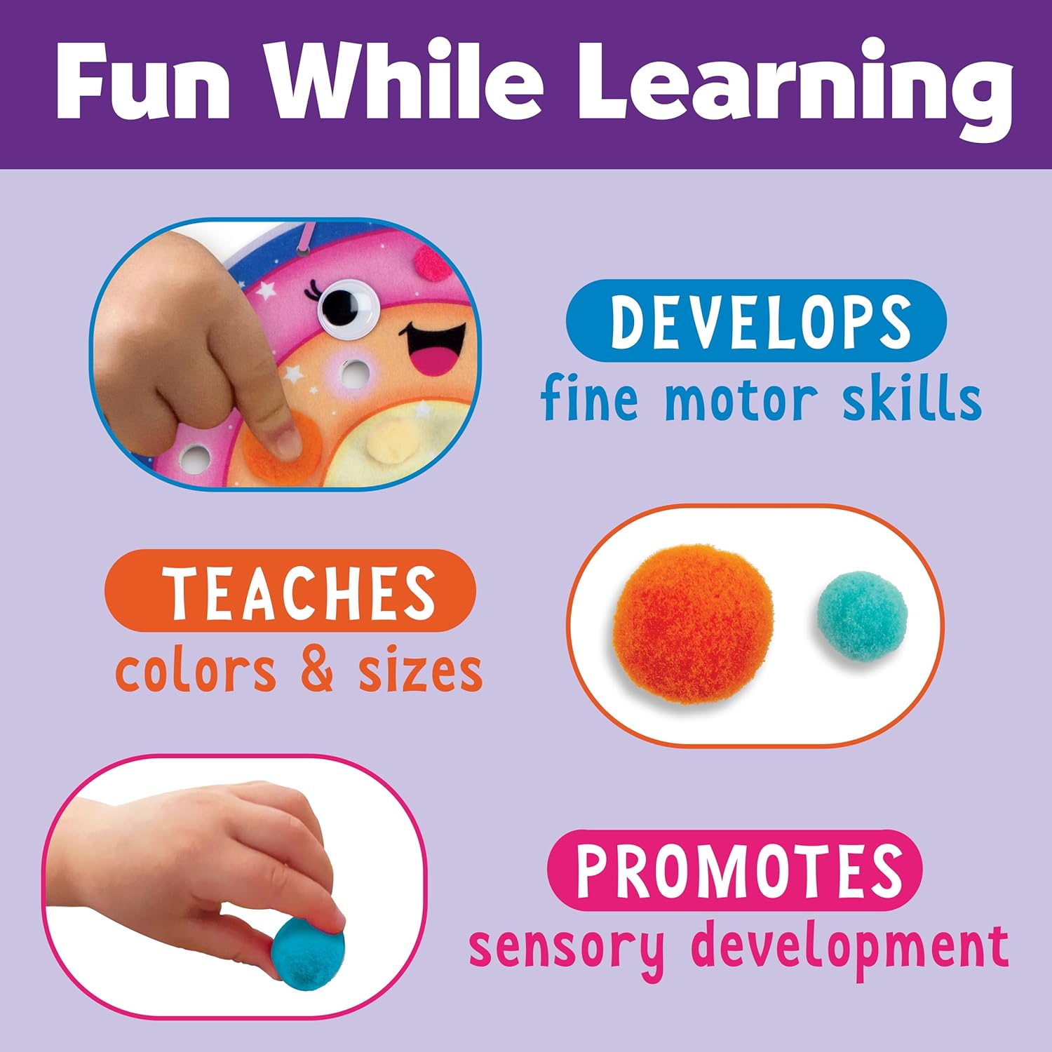 - SENSORY TOYS FOR TODDLERS - Develop fine motor skills, teach colors and sizes while promoting sensory development with a "repeat play" preschool learning activity! Pom Pom Pictures is a sensory toy that is easy to complete and encourages independent, quiet-time play