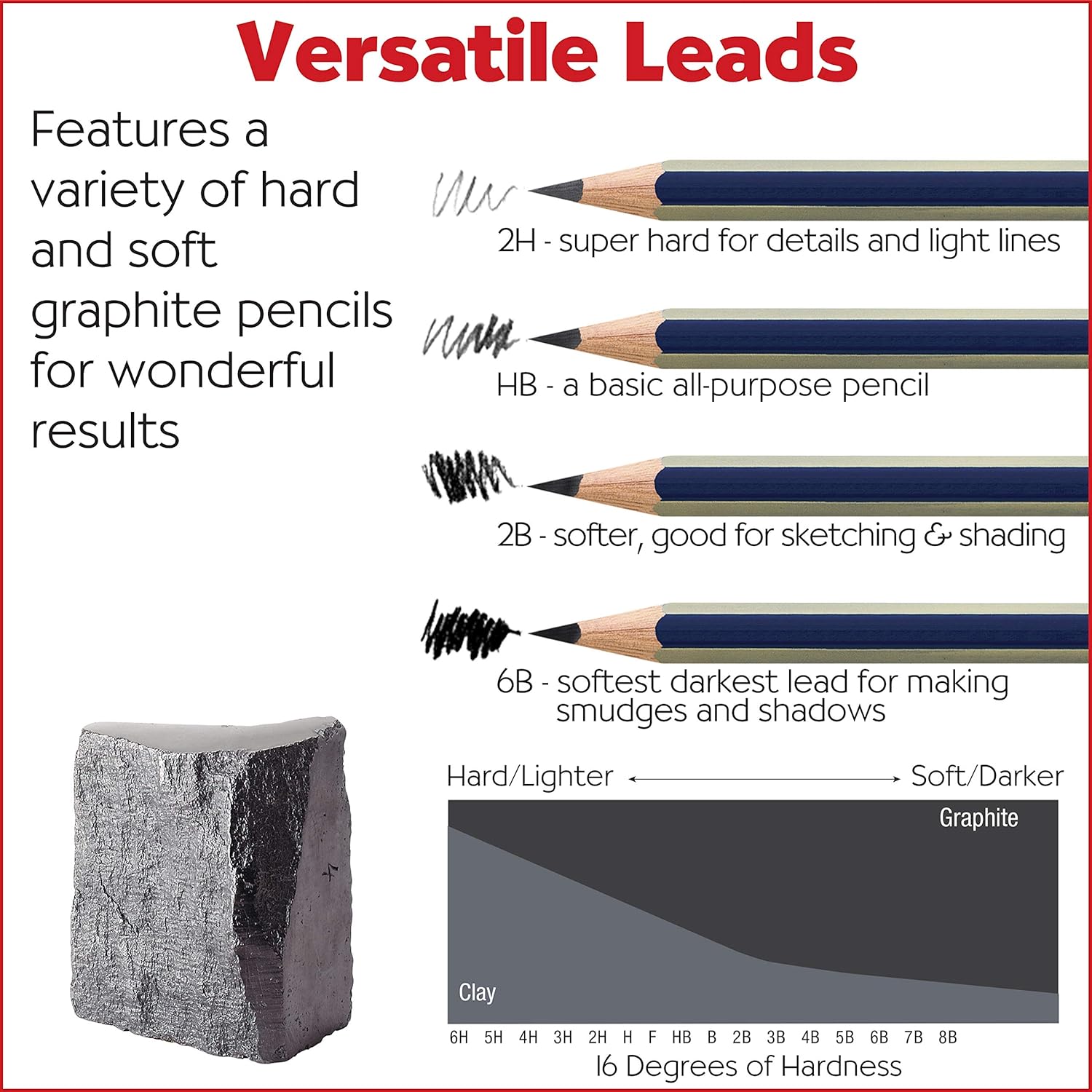 - ART PENCILS - Use the quality soft and hard Faber-Castell lead pencils to create a variety of different shadings and drawings! The pencils 6B, 2B, HB and 2H are a perfect range for beginner and young artists to explore drawing and sketching